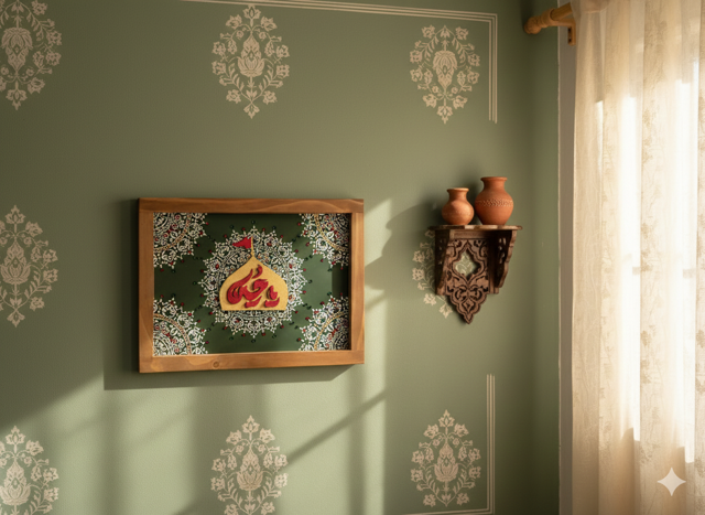 تابلو هنری کالیگرافی «یا حسین» ساختهشده با طراحی اصیل اسلامی، زمینه سبز تزیینشده با نقوش سنتی و نگینکاری دستی ظریف. این تابلو دارای قاب چوبی طبیعی با کیفیت بالا بوده و انتخابی خاص برای دکوراسیون مذهبی، هدیه مناسبتی، نذری فرهنگی و فضای معنوی منزل یا محل کار است.