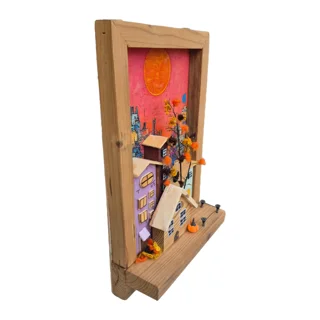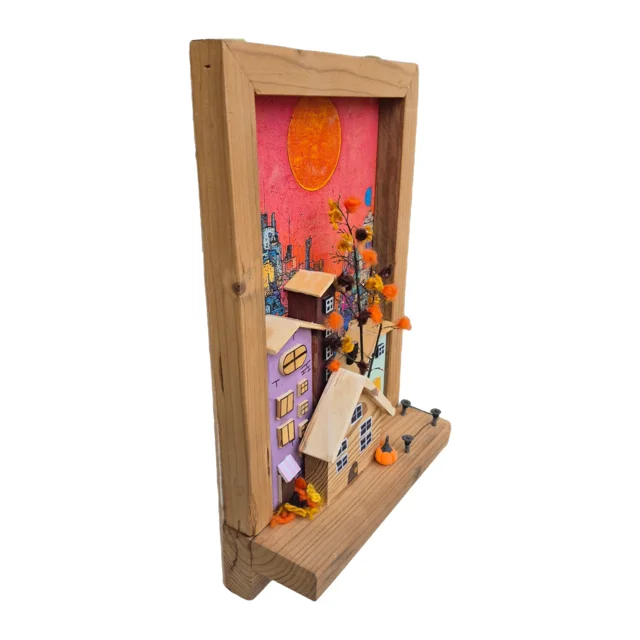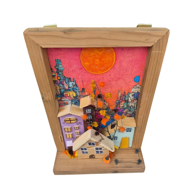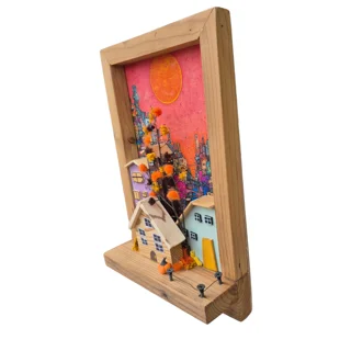 جاکلیدی دیواری دستساز از چوب ترموود با طراحی سهبعدی خانههای دهکده در قاب چوبی، رنگهای پاستیلی و پنجرههای برجسته. پسزمینه چاپی پیکسلی و خورشید جلوهای مدرن به دکور میدهد و نظم کلیدها را به زیبایی حفظ میکند.
