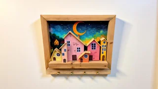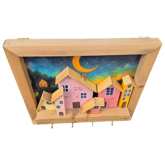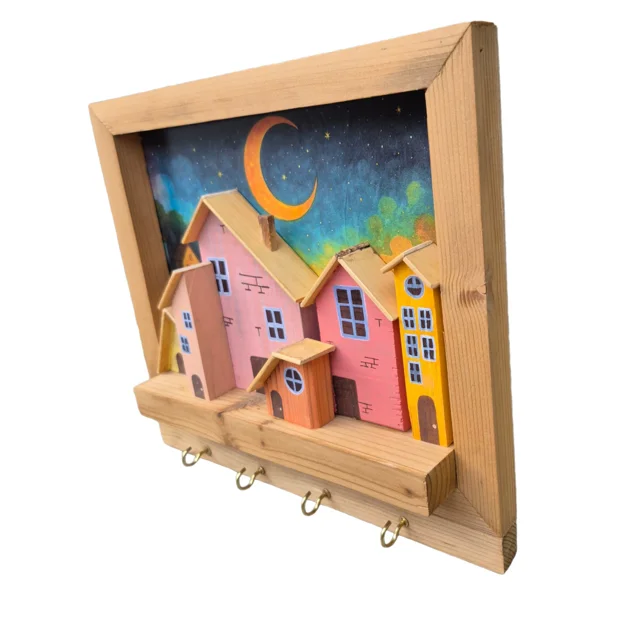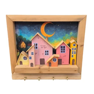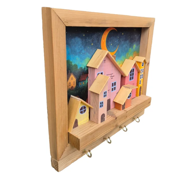 تابلو و جاکلیدی دیواری چوبی دهکده شاد، طراحی زیبا و کاربردی با جنس چوب باکیفیت، مناسب برای نظم دادن به کلیدها و تزئین دیوار، جلوهای دلنشین به فضای منزل شما میبخشد و حس خوشایندی از آرامش و شادی را ایجاد میکند.