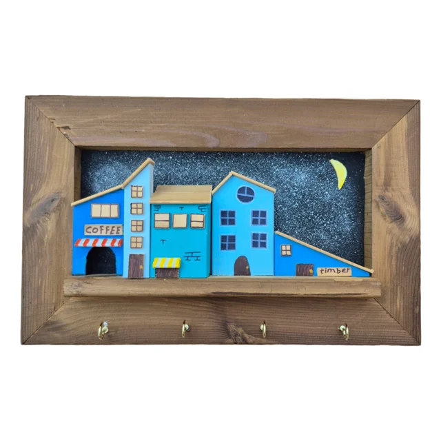 جاکلیدی دیواری دستساز با طرح خانههای سهبعدی دهکده، ساخته شده از چوب ترموود با کیفیت بالا و قاب چوبی مستحکم و مقاوم در برابر رطوبت. خانهها با رنگهای پاستیلی ملایم و پنجرههای برجسته و نقاشیشده تزئین شدهاند و پشتزمینه با رنگ اکرولیک هنرمندانه طراحی شده است. این جاکلیدی علاوه بر کاربردی بودن، جلوهای دکوراتیو و دلنشین به فضای شما میبخشد و گزینهای ایدهآل برای هدیه دادن یا زیبا کردن دیوار خانه است.